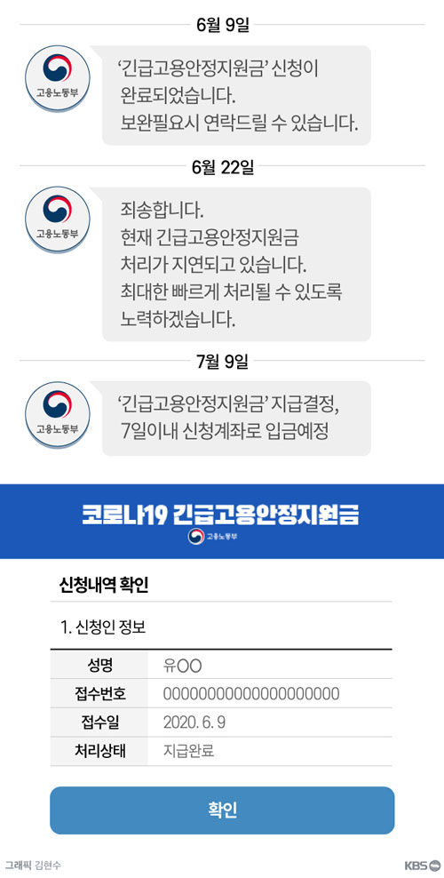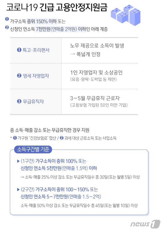 긴급고용안정지원금 / ëíë¯¼êµ ê³ ì©ë ¸ëë¶ ê¸´ê¸ê³ ì©ìì ì§ìê¸ 6ì 1ì¼ë¶í° ì ì² ê°ë¥í©ëë¤ ê°êµ¬ìë ì¤ì 150 ì´í ëë ì ì²ì¸ ì°ìë 7ì²ë§ì ì°ë§¤ì¶ 2ìµì ì´íì´ë©´ì ìë ë§¤ì¶ ê°ì ëë 무ê¸í´ì§í ê²½ì° ì 50ë§ì X ìµë 3ê°ì 150ë§ì ê³ ì©ë ¸ëë¶ ê³ ì©ë¶ ë ¸ëë¶ ì½ë¡ë19 : 고용부는 지난 6월 1일부터 긴급고용안정지원금 신청을 받았지만 지난 4일에서야 심사 완료율 99.9%를 달성했다.